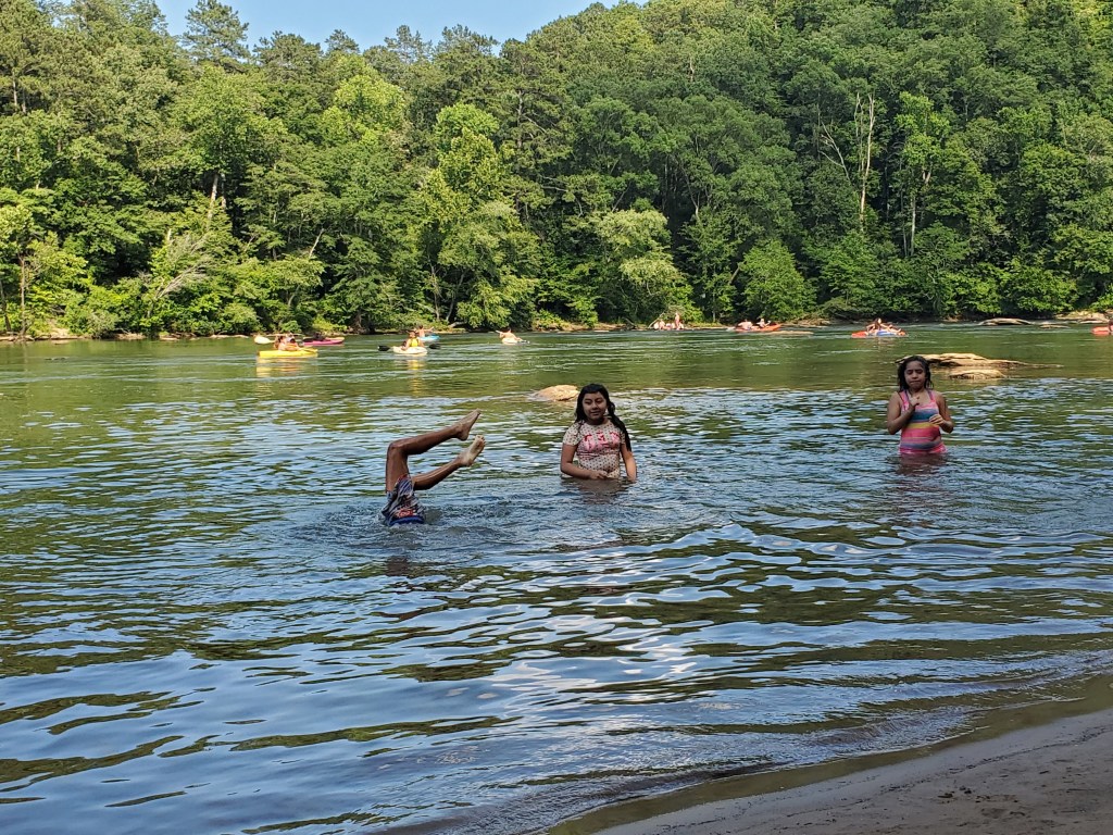 Akers Mill: Palisades West Trail: 932 Akers Ridge Dr. SE Atlanta, GA 30339. This is probably my favorite of all the places listed, and we have been there twice. It’s easy to miss the turn in so look for the big fake water wheel at your turn in off the main road. The first parking area is closed but keep going straight until you dead end into the last one. There were a million people at Cochran Shoals yesterday and no one here, but there will be lots of folks when you get down to the river. Go on a weekday. Follow the trail sign down to the river and take a left. You will see teenagers throwing themselves off a twelve foot rock called jumping rock on the other side of the river. Keep going and you will get to a place where there are bathrooms and life jackets for loan on a rack to use for getting in the water. Keep going a little more and you will find a very small and delightful beach on the right where there is enough room for three families to socially distance. The water is calm enough here kids can swim while you watch the rafters and the hawks. So beautiful!