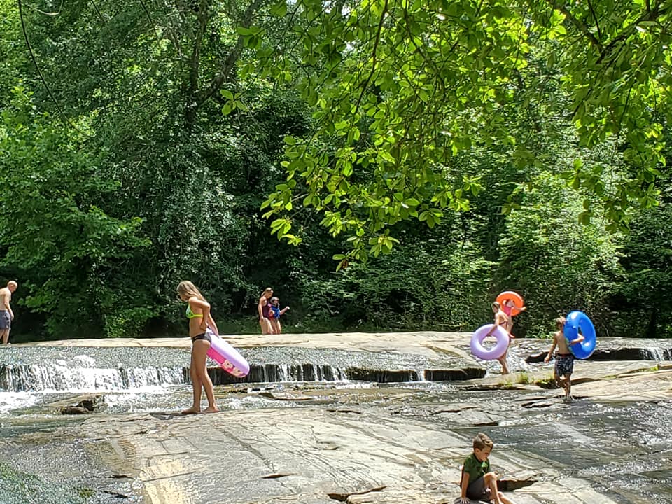Poole’s Mill Bridge Park: 7725 Pooles Mill Rd, Ball Ground, GA 30107. I highly recommend this beautiful park in Forsyth county. Bring a tube for each person that wants to slide to protect your back side from the rocks, water shoes, and your kids of all ages to slide down the manageable rock slides. It is slippery so be very careful and stick to the mossy areas. But even I slid on the rocks and I am a chicken and it was fun. Super family friendly and very nice but not at all diverse. There is a covered bridge, a still river to swim in and a rope swing. Don’t go on the weekend.