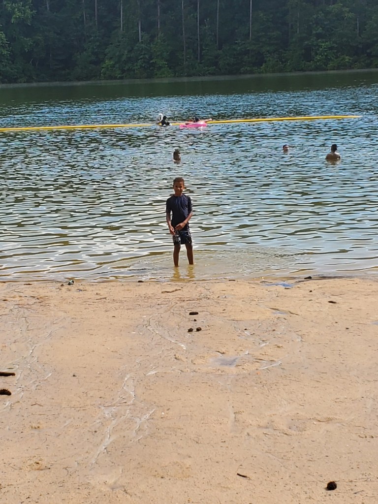 We had one corner spot of the lake picked out where there were fewer people because there is this pipe going across the lake serving as a swimming boundary line. But there are no lifeguards and people (including us) went past the pipe in order to spread out as it is still shallow enough for kid safety just beyond the line.