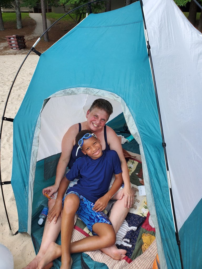 We went on a Friday afternoon, and I didn’t know it was going to rain. It was not so crowded that it wasn’t feasible and I brought my twenty-five year old tent with the broken tent pole to set up on the beach so we could hide in that if crowds got too thick. Yes, you are allowed to have a tent apparently. But in the high sun, even without the rain flap, it was sweltering.